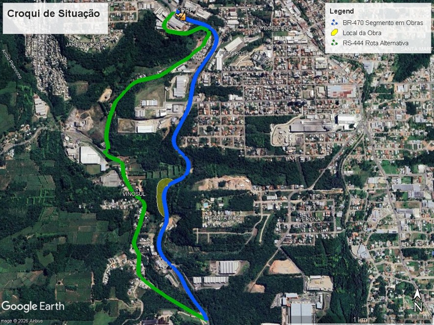 O Departamento Nacional de Infraestrutura de Transportes (DNIT), em conjunto com a Polícia Rodoviária Federal (PRF), informa que a BR-470, no município de Bento Gonçalves, passará por estreitamento de pista e operação Pare e Siga no segmento compreendido entre o km 216 e o km 220, em razão de obras programadas no km 217.